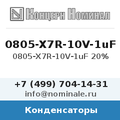 0805-X7R-10V-1uF 20% — конденсатор, артикул 606703. Основные характеристики: ёмкость 1 мкФ, группа ТКЕ X7R, рабочее напряжение 10 В, допуск ±20%. Конденсатор применяется в фильтрующих, разделительных и времязадающих цепях электронных устройств. Отгрузка со склада в Москве, доставка по всей России — транспортными компаниями, курьером или почтой. Принимаем оплату наличными, переводом, по безналу. Подробности и заказ: nominale.ru, +7 (499) 704-14-31.